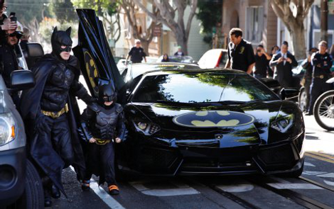 Δύο μαύρες Λαμποργκίνι είχαν μετατραπεί σε «Μπάτμομπιλ», το όχημα του Μπάτμαν, η κυκλοφορία στους δρόμους διακόπηκε και ελικόπτερα πετούσαν πάνω από την πόλη. Ο πραγματικός αστυνομικός διευθυντής του Σαν Φρανσίσκο, ένας εισαγγελέας και ένας πράκτορας του FBI συμμετείχαν ενεργά, παραλαμβάνοντας τους κακοποιούς, τον Γρίφο και τον Πιγκουίνο, από τα χέρια του υπερήρωα και ασκώντας τους δίωξη για απόπειρα ληστείας, απαγωγή και παρεμπόδιση της δικαιοσύνης.